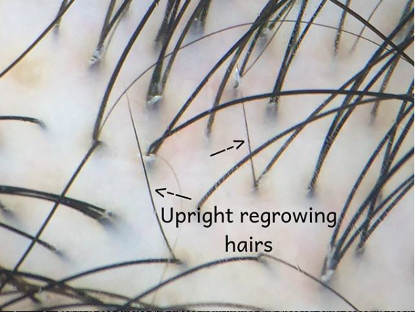 Regrowing hairs are new (i.e., recovered) hairs that are growing out of the skin. They're usually spotted on phototrichogram examinations and can be used as an early indication that a treatment might be working.